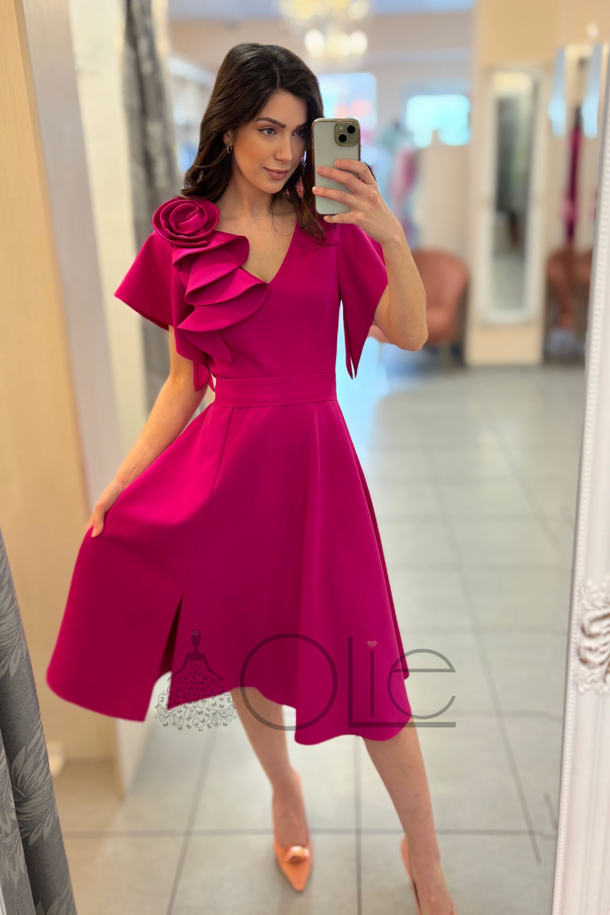 Šaty majú výstrih do V a krátke rukávy, pričom dominantným prvkom je ozdobná aplikácia v tvare kvetu na ramene, ktorá dodáva modelu luxusný vzhľad. Zvýraznený pás krásne formuje siluetu a áčková sukňa zabezpečuje pohodlie pri nosení.
