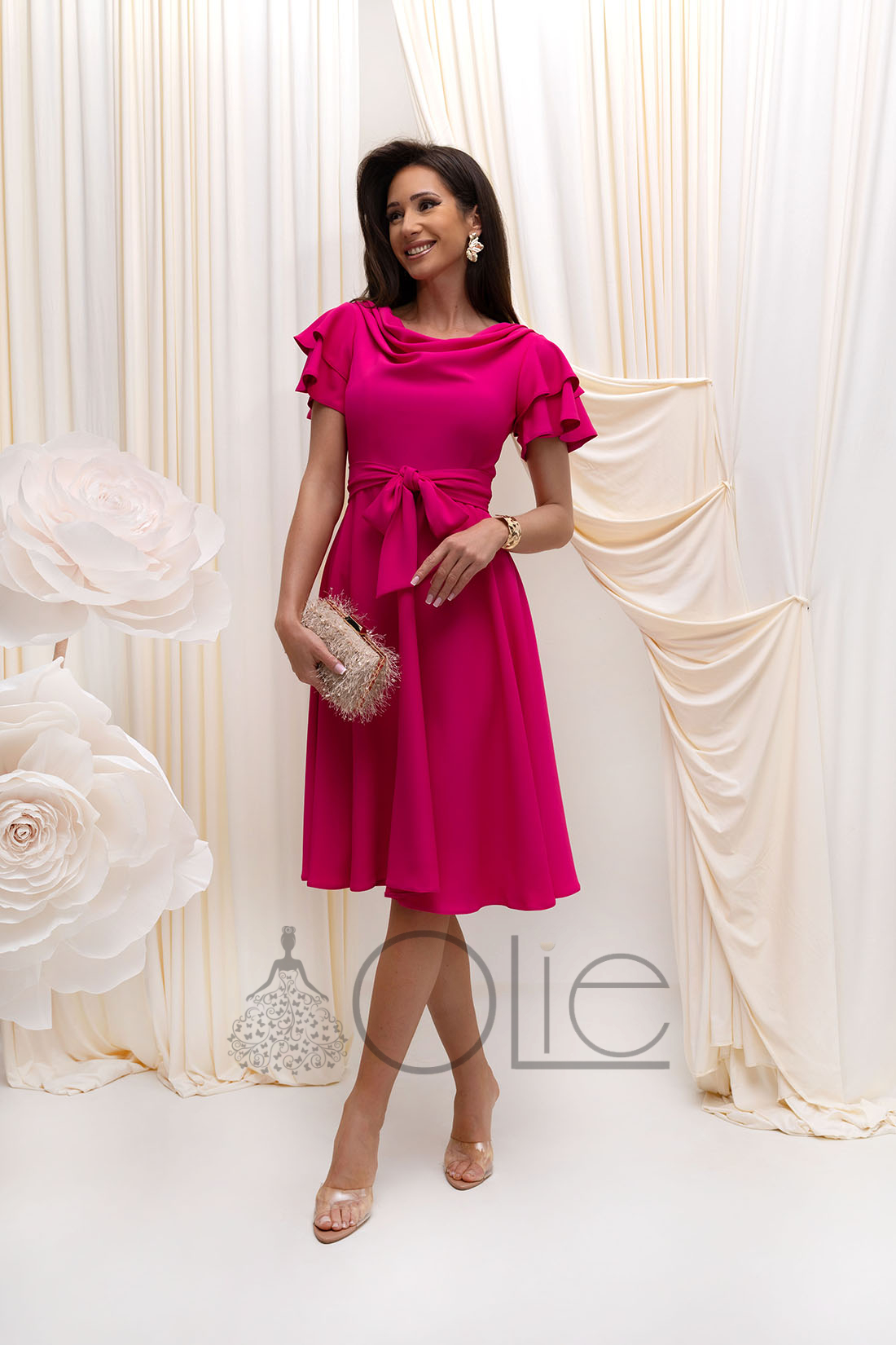 Šaty majú krátke rukávy s jemným volánom a elegantný výstrih, ktorý dodáva modelu sofistikovaný vzhľad. Viazanie v páse zvýrazní ženskú siluetu a umožňuje prispôsobiť šaty postave.