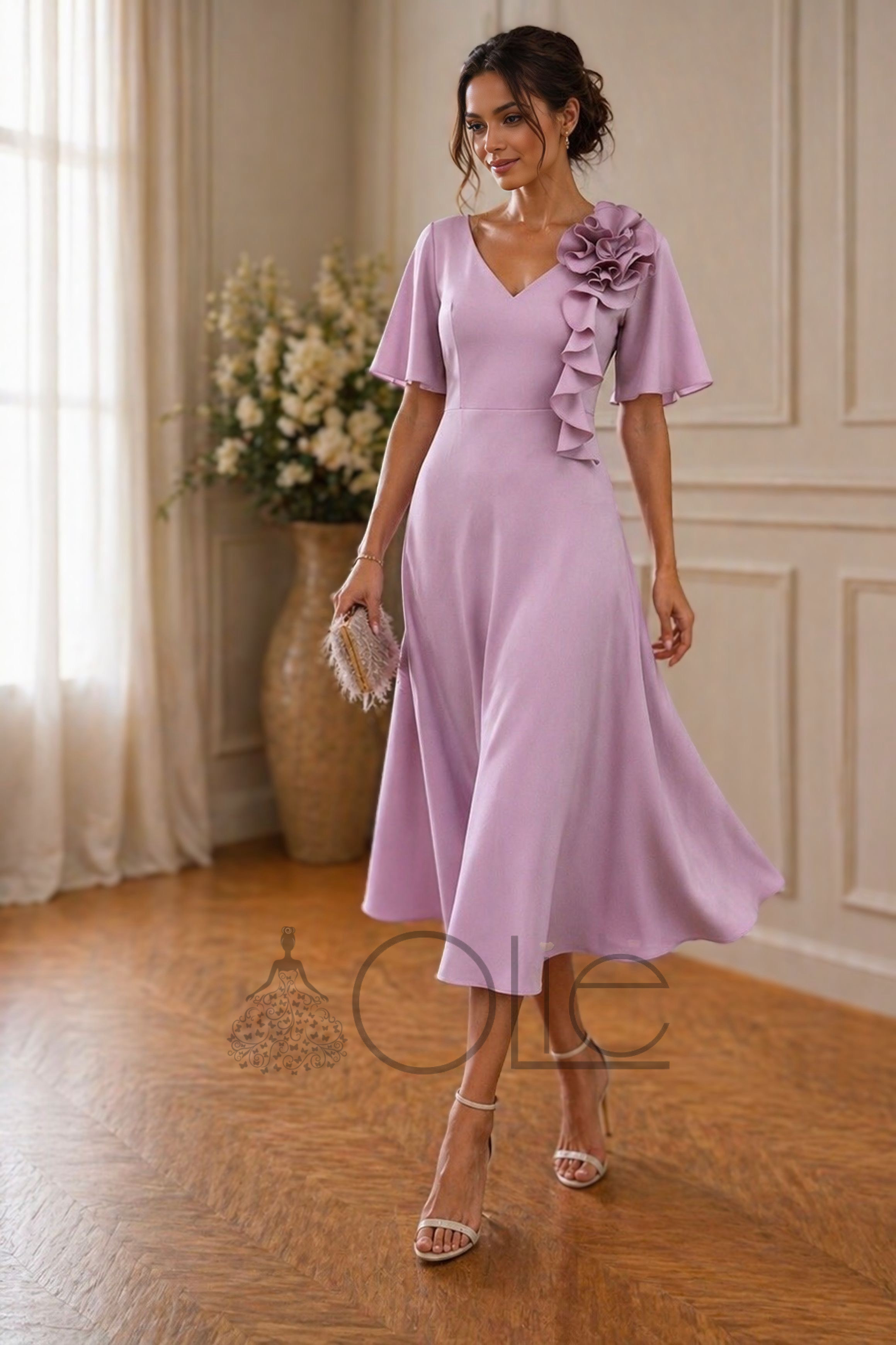 Tieto šaty na svadbu sú obľúbené najmä ako šaty pre svadobnú mamu, vďaka decentnému dizajnu, romantickému detailu na ramene a elegantnej midi dĺžke. Materiál je ľahký a príjemný, vďaka čomu sú ideálne aj ako šaty na letnú svadbu.