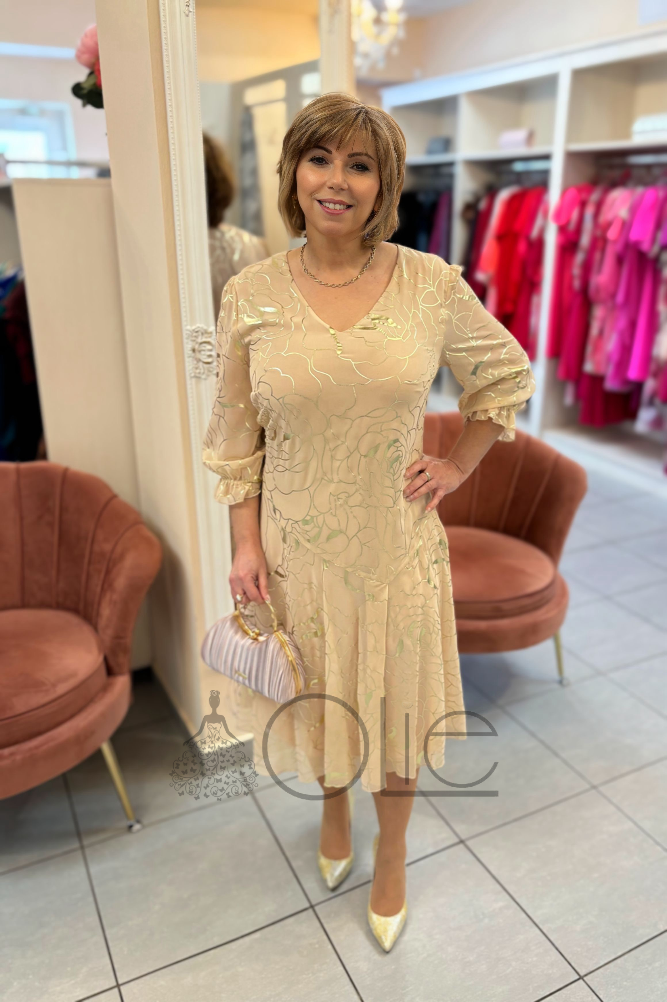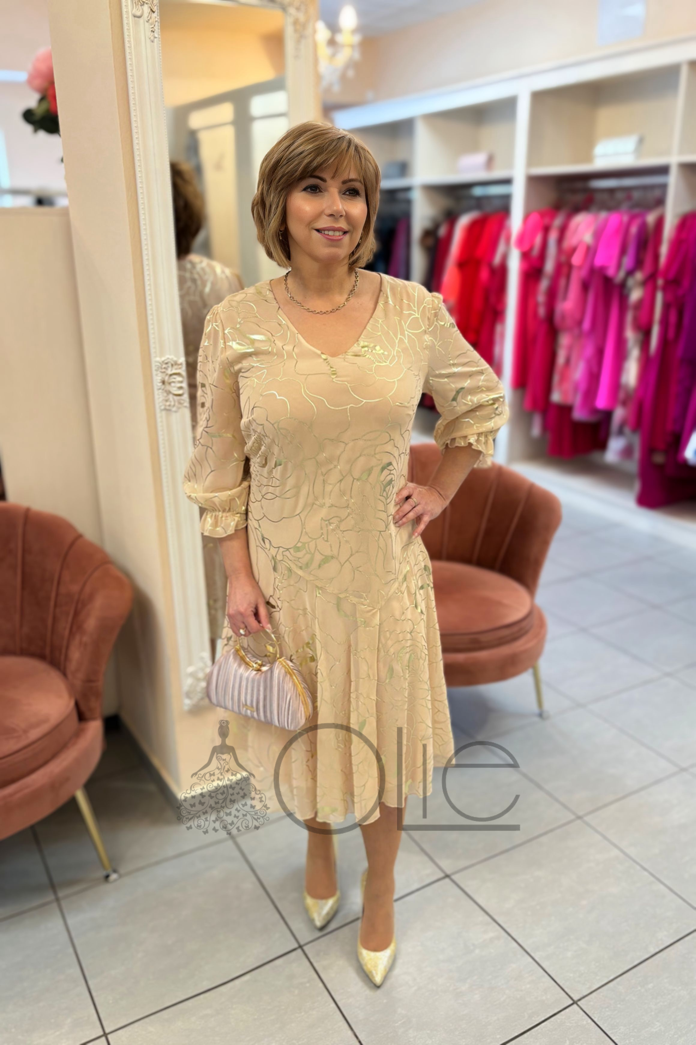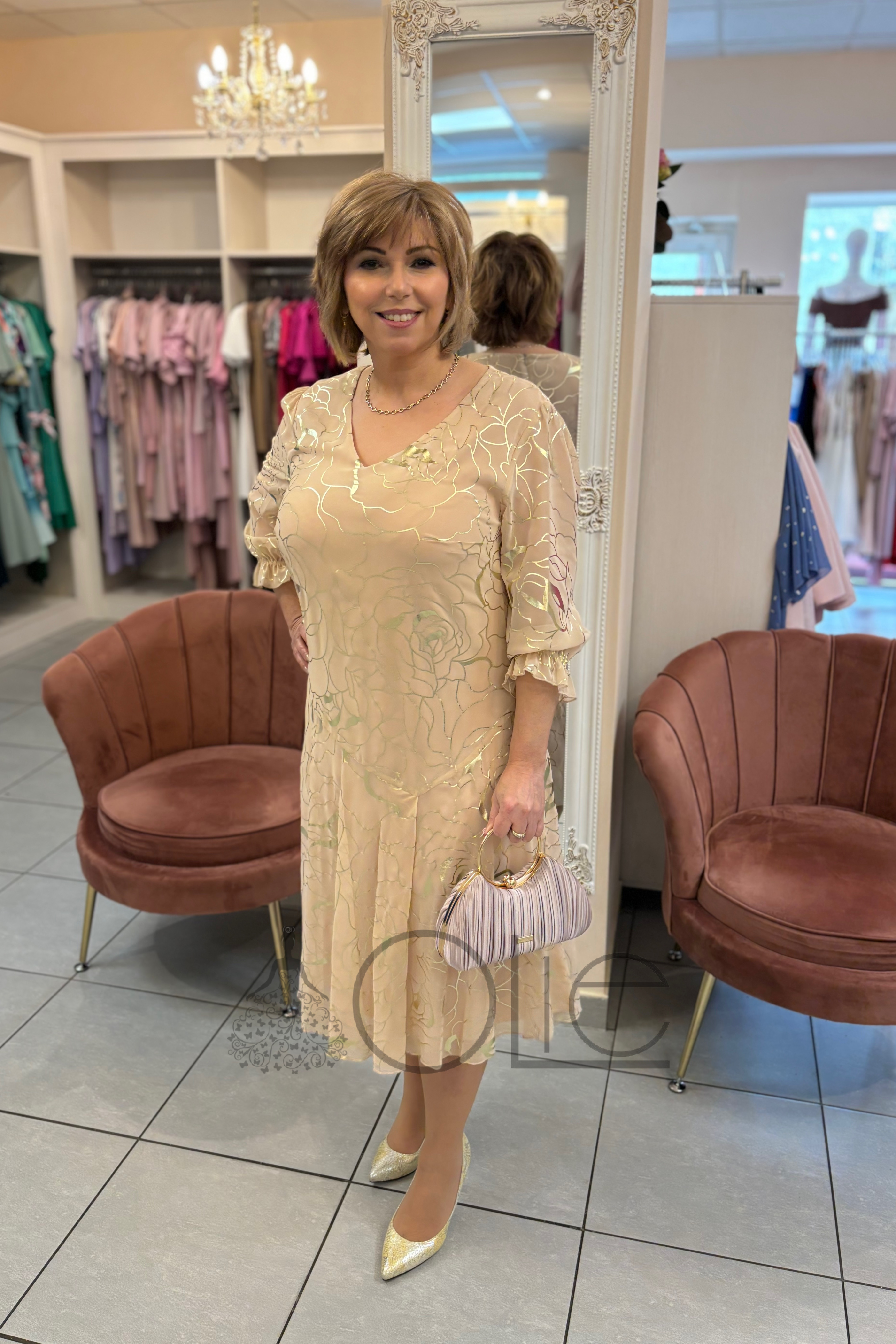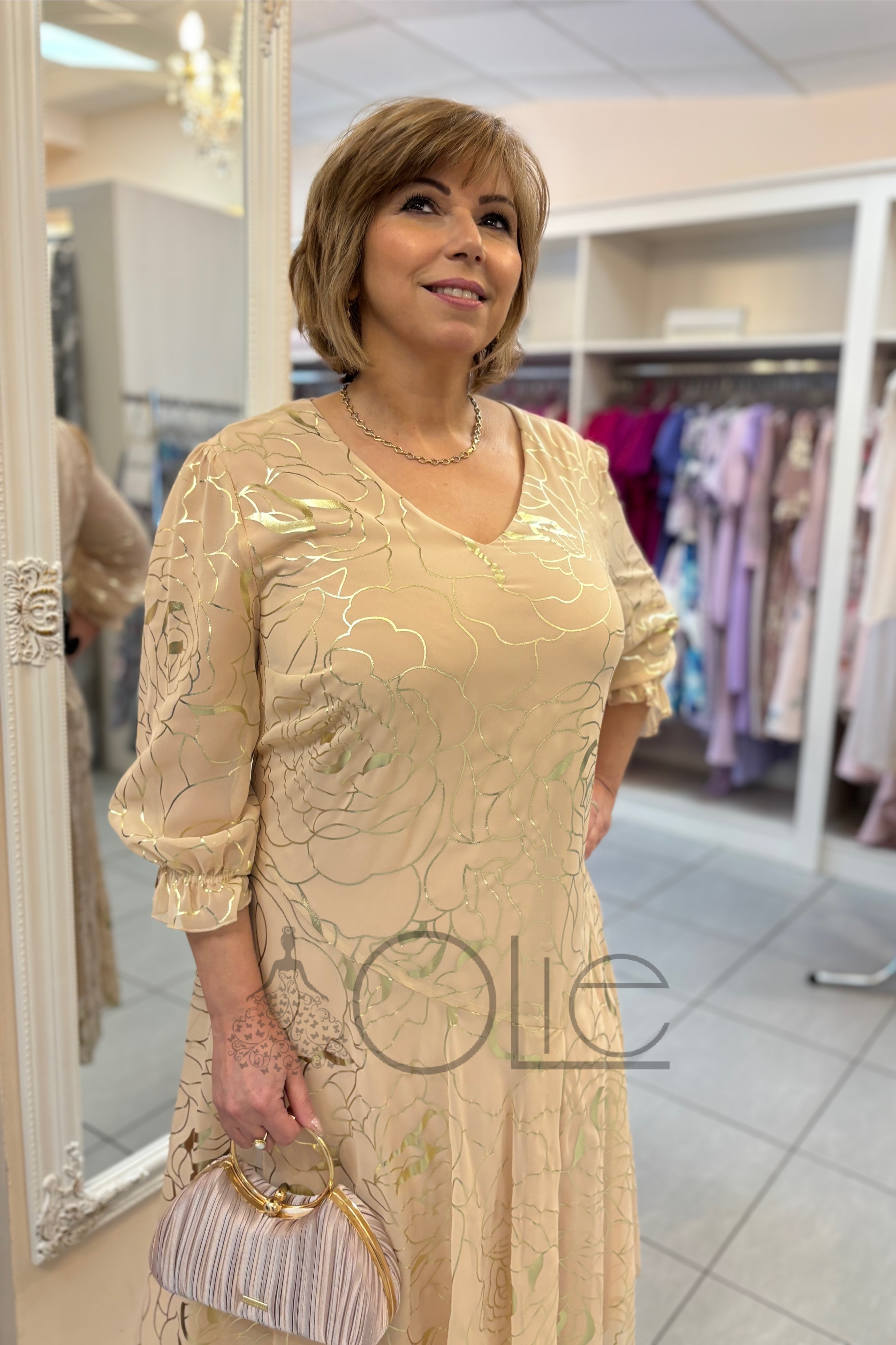 Tieto tenké šifónové spoločenské šaty na svadbu sú ideálnou voľbou pre ženy, ktoré hľadajú eleganciu, pohodlie a nadčasový štýl. Jemný béžovo-zlatý odtieň s decentným vzorom dodáva šatám luxusný a slávnostný vzhľad, vďaka čomu sú perfektné ako šaty pre svadobnú mamu, šaty pre hostí na svadbu, šaty na oslavu alebo rodinné spoločenské udalosti.