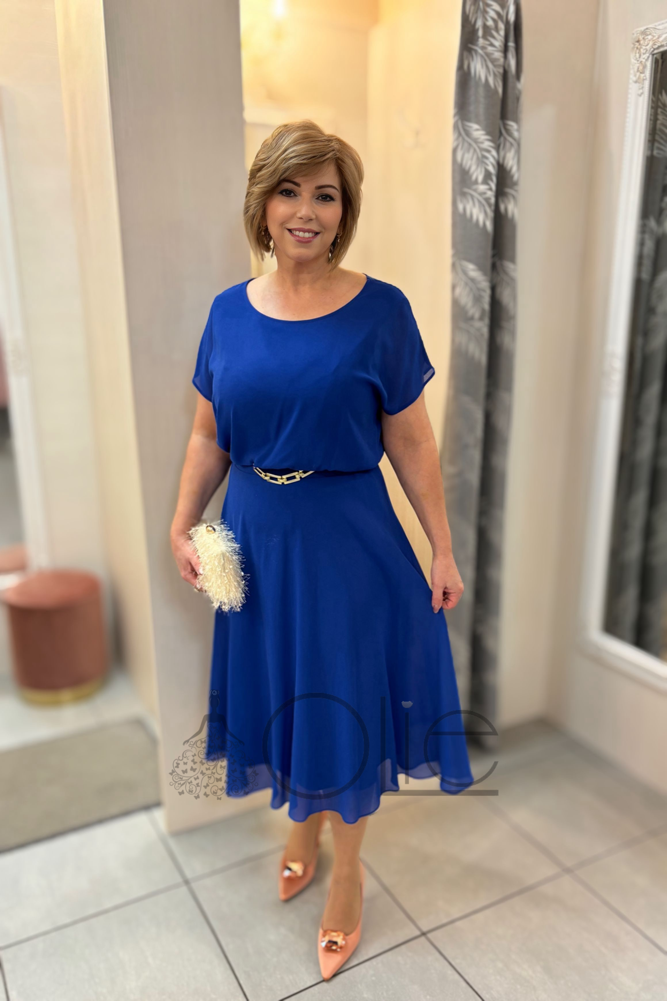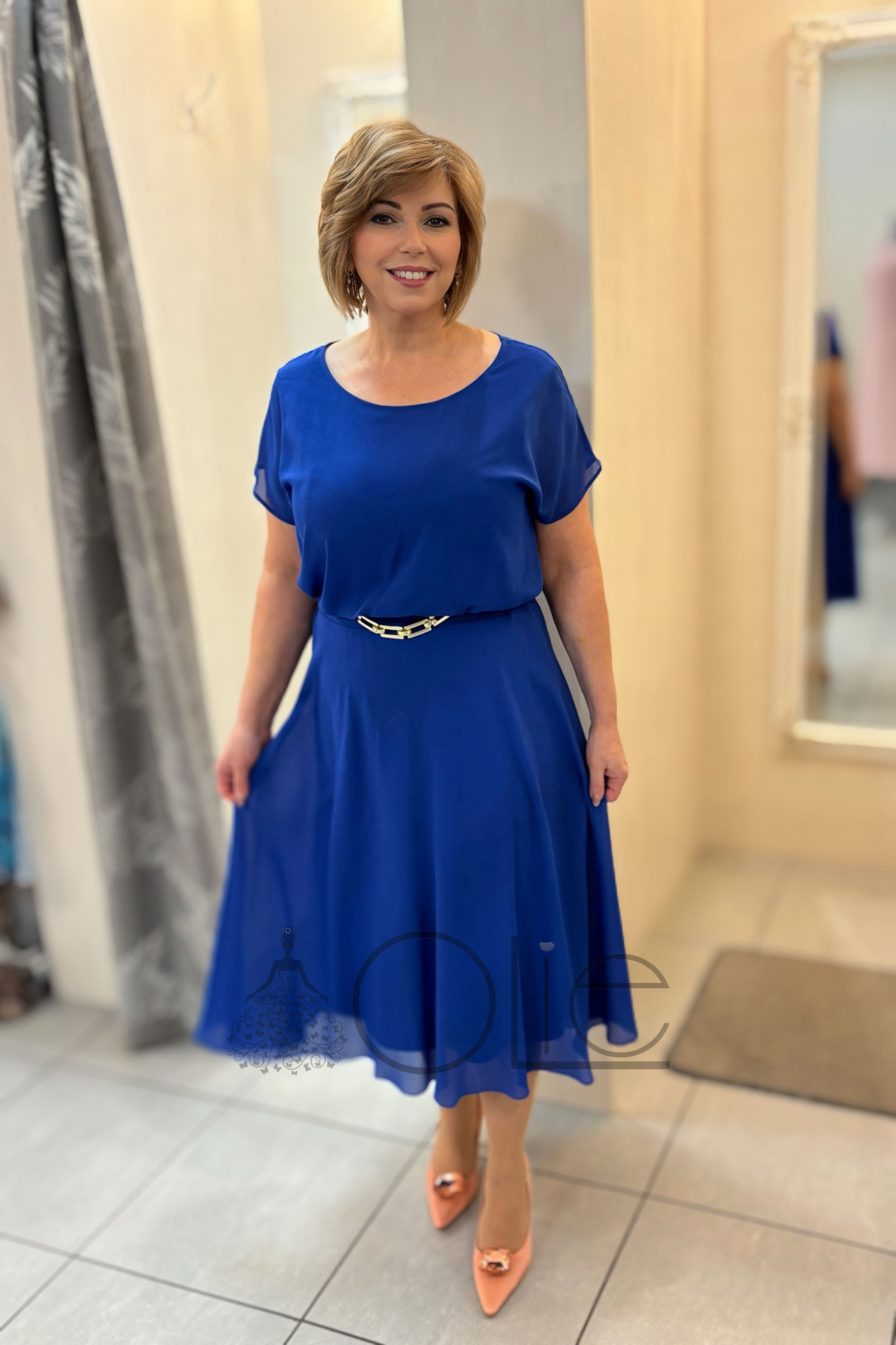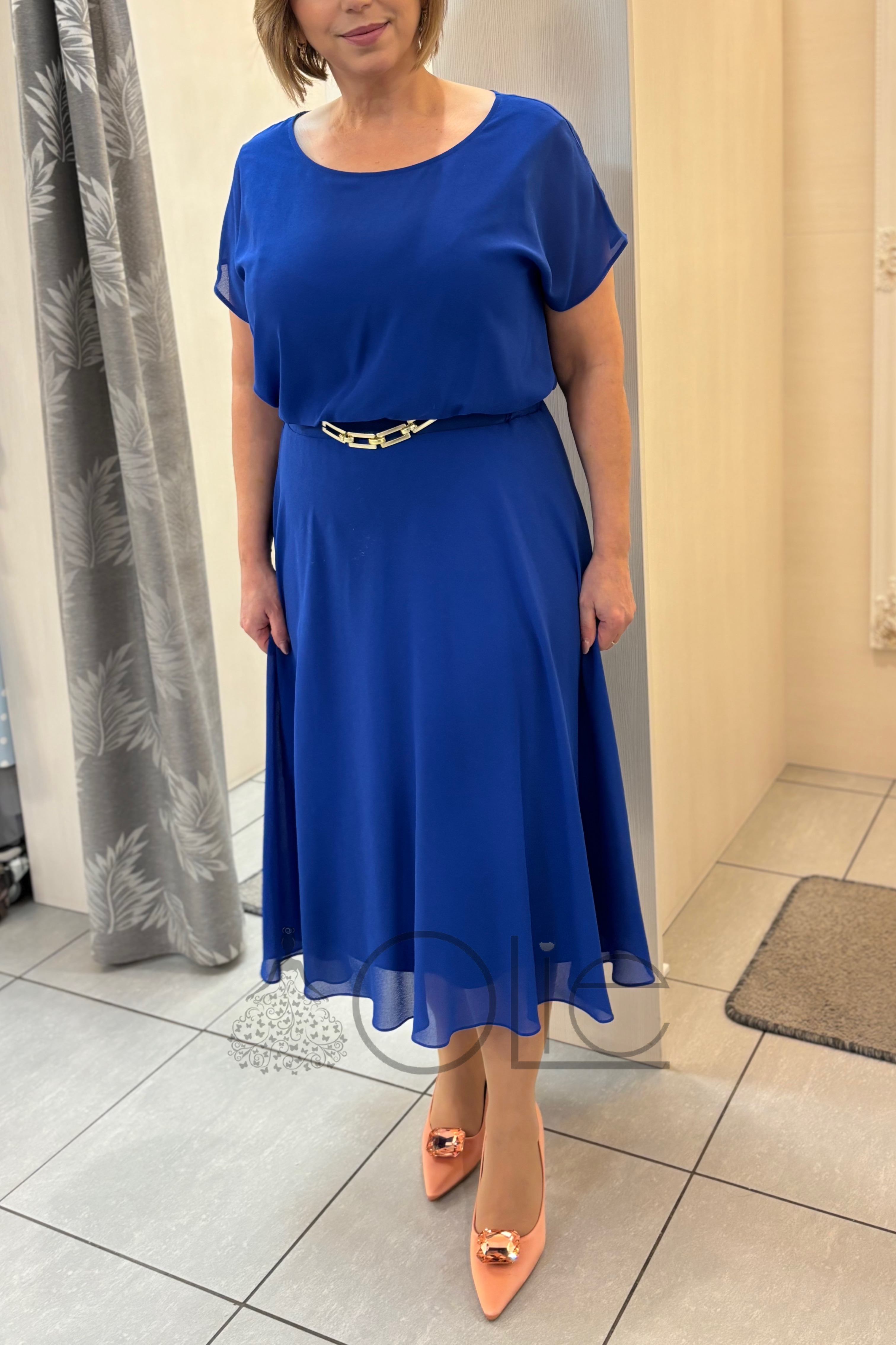 Šaty majú voľnejší vrch s krátkymi rukávmi, ktorý zabezpečuje maximálne pohodlie a zároveň lichotí aj plnšej postave. Zvýraznený pás s jemným opaskom krásne formuje siluetu a áčková midi sukňa dodáva eleganciu a voľnosť pohybu.