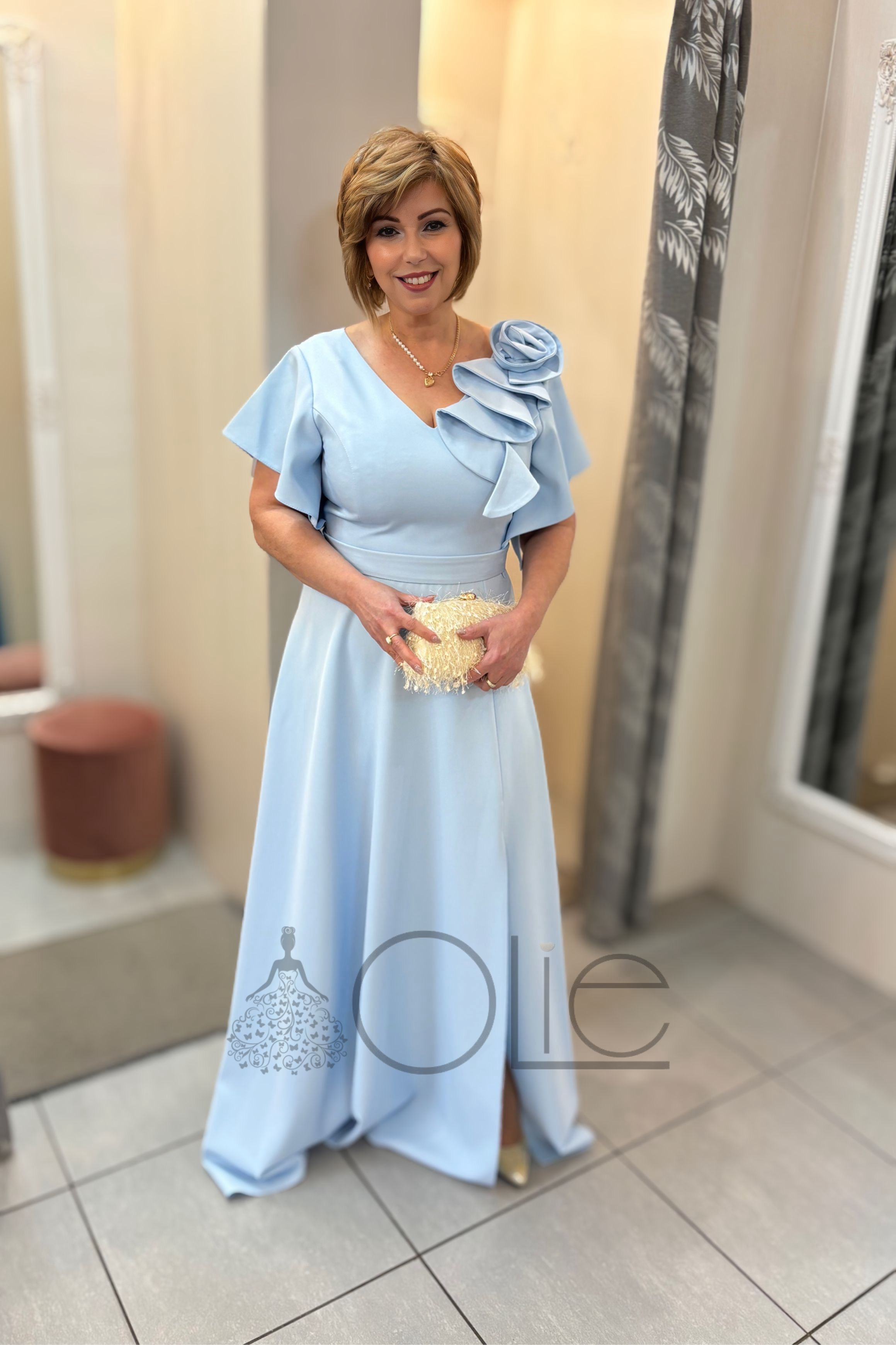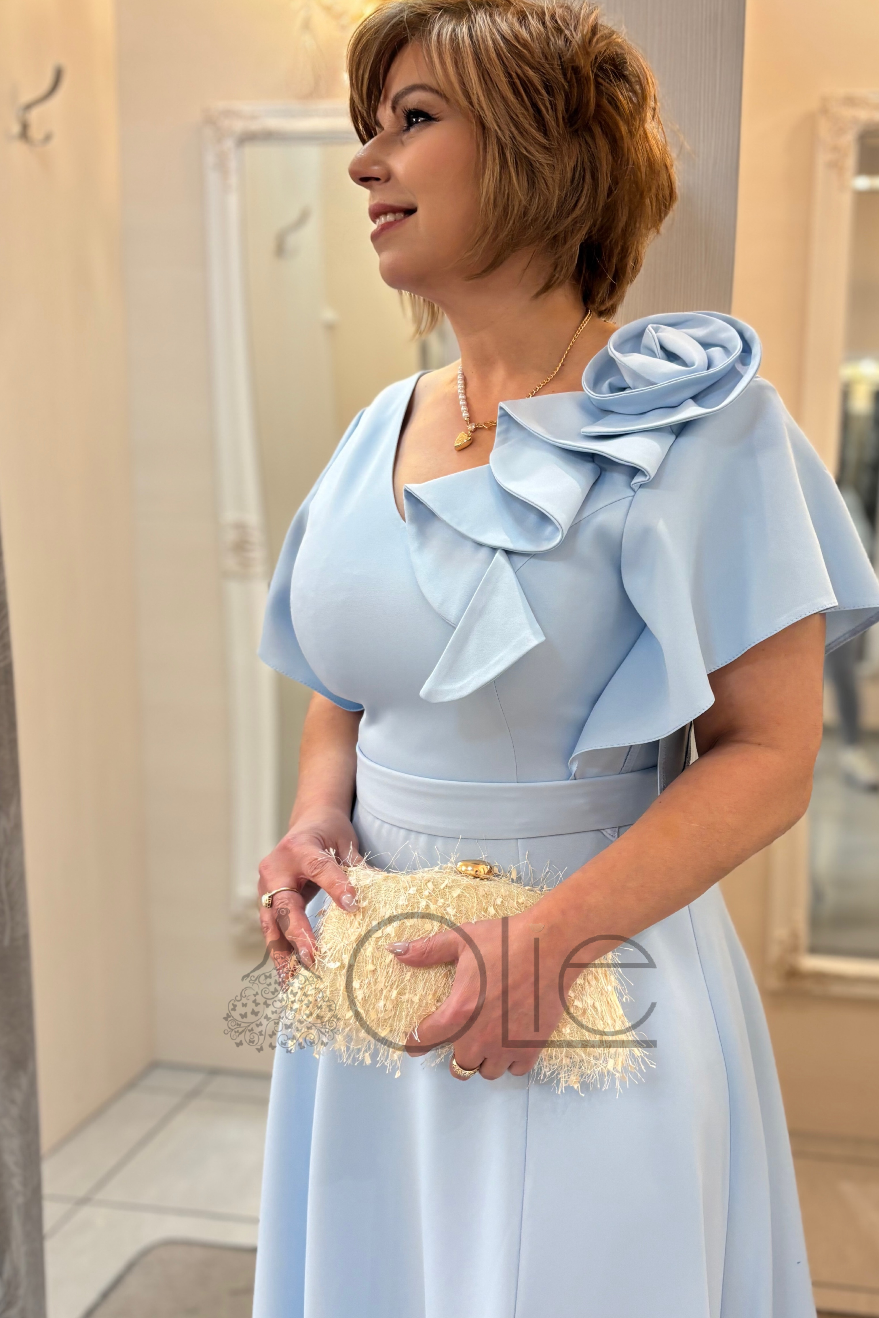 Tieto dlhé svetlo modré spoločenské šaty sú stelesnením nadčasovej elegancie a ženskosti. Jemný splývavý materiál krásne kopíruje postavu a zároveň poskytuje pohodlie počas celého večera. Dominantným prvkom je nápadná ozdoba v tvare kvetu na ramene a viazanie v páse, ktoré opticky zoštíhľuje siluetu.