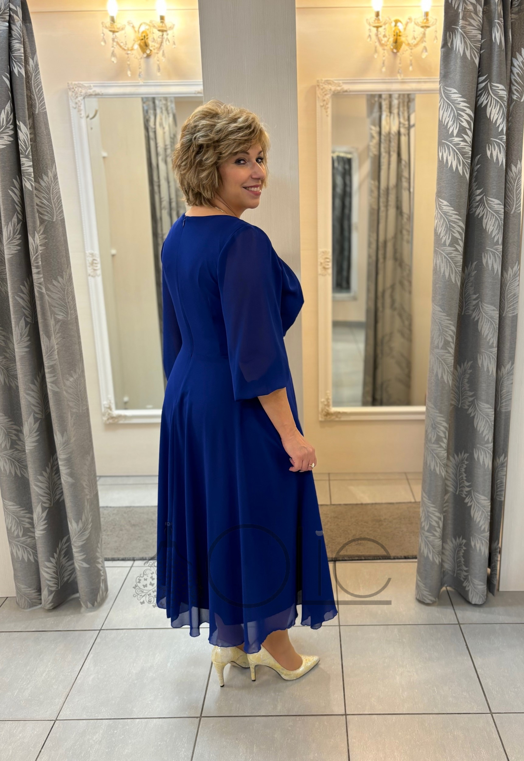 • Modré šifónové midi šaty na svadbu Bella