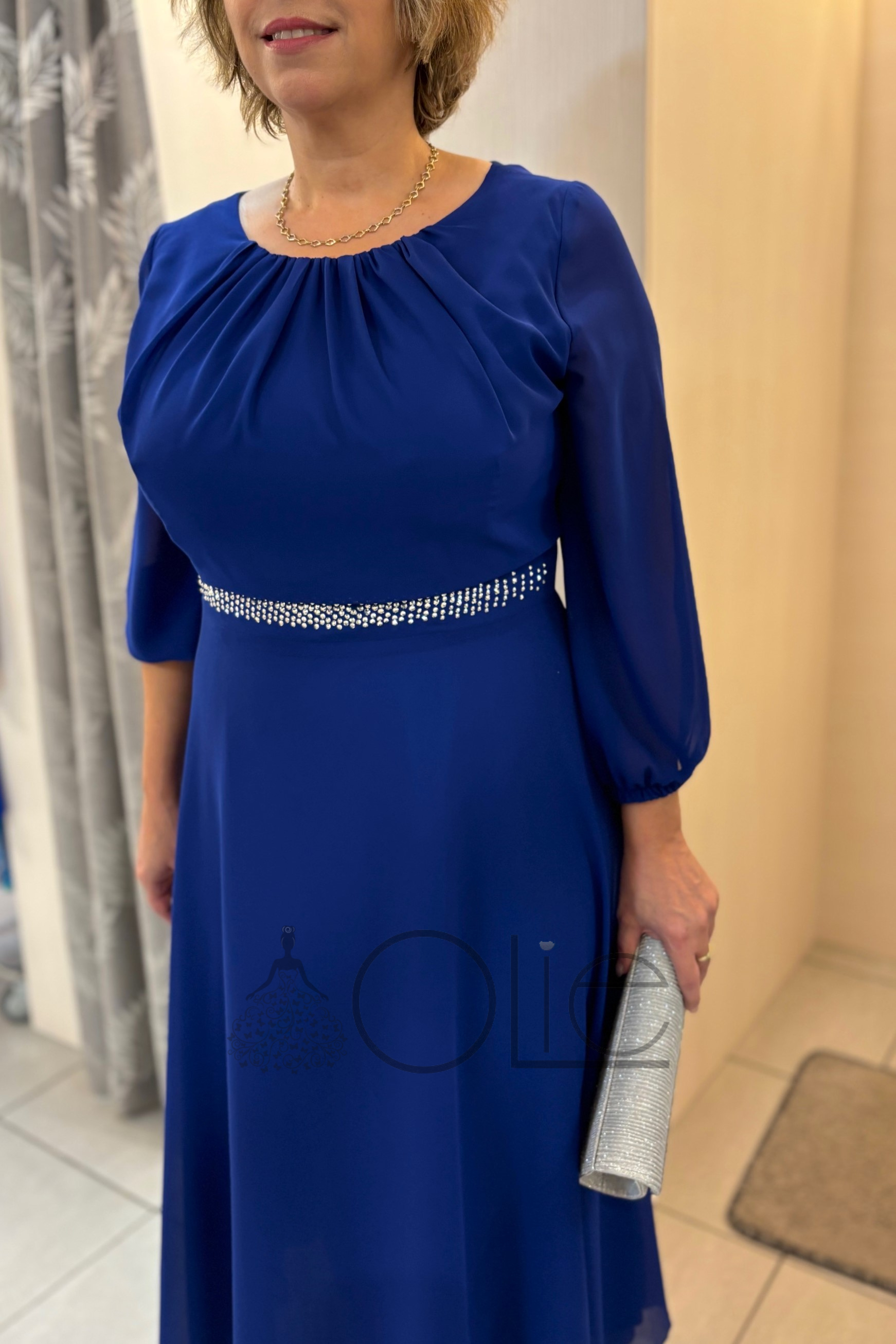 Vzdušný šifónový materiál zabezpečuje pohodlie počas celého dňa. Model zaujme najmä ľahkou padavou midi sukňou a decentnými kamienkami v páse, ktoré dodávajú šatám jemný slávnostný akcent. Šaty sa zapínajú na zips, vzadu plne zakrývajú chrbát a majú spodničku pre komfortné nosenie.