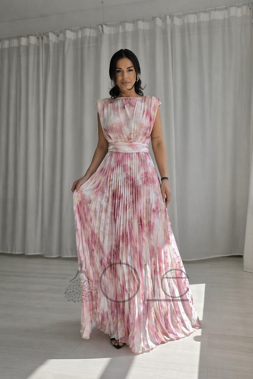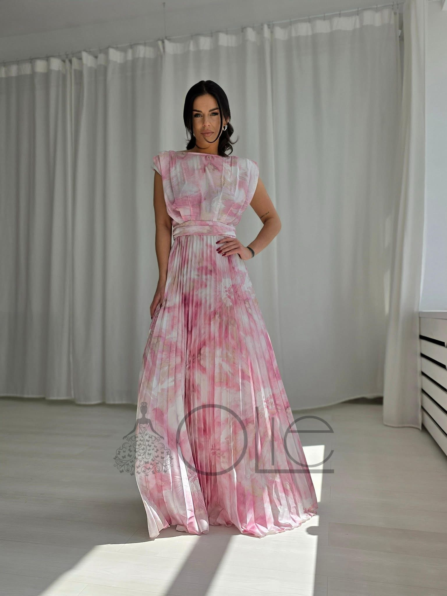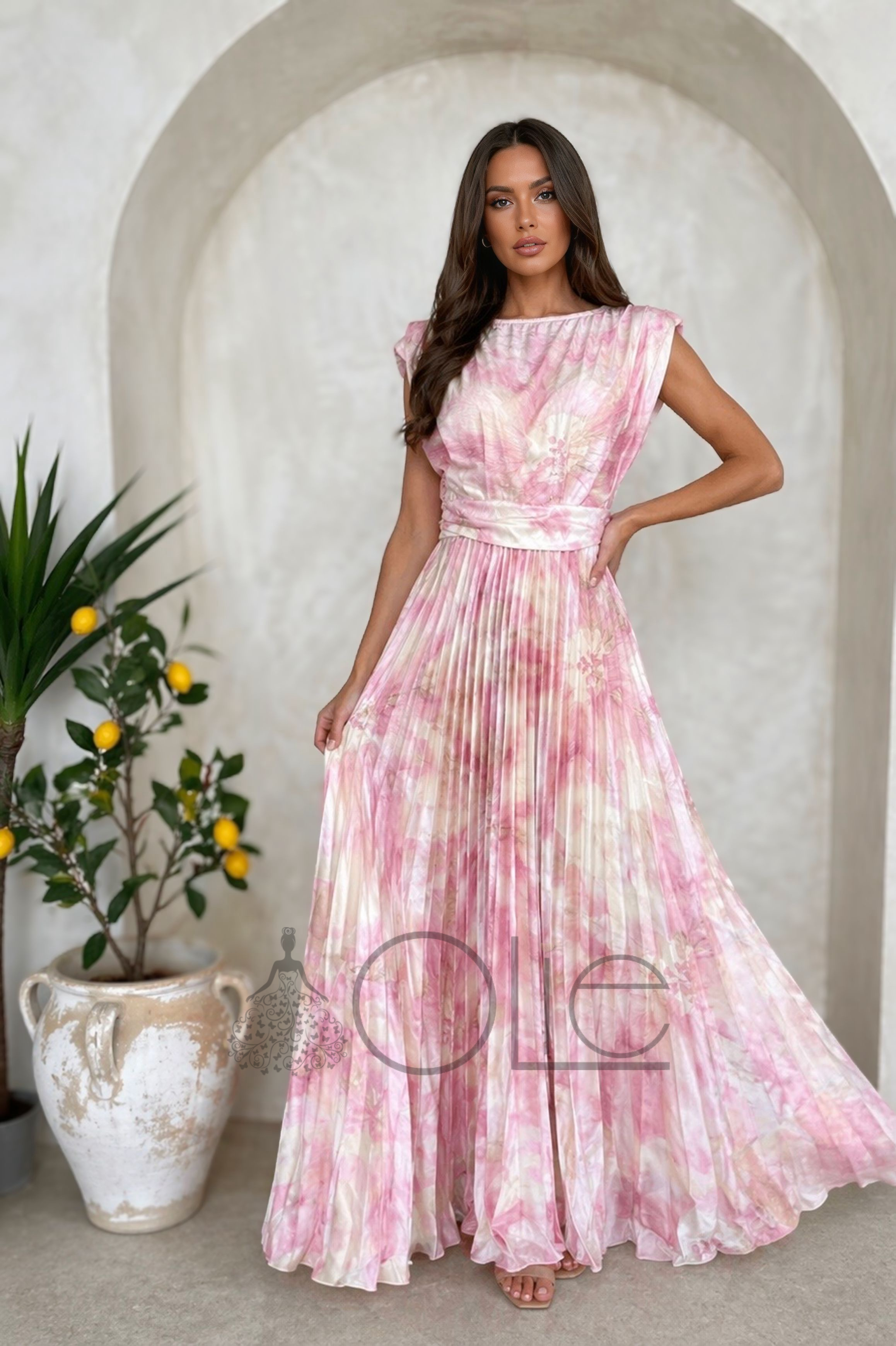 Tieto dlhé plisované spoločenské šaty v jemnej ružovej farbe s decentným kvetinovým vzorom sú ideálnou voľbou ako šaty na svadbu. Ľahký a vzdušný materiál zabezpečuje pohodlie počas celého dňa, najmä v teplejších mesiacoch.