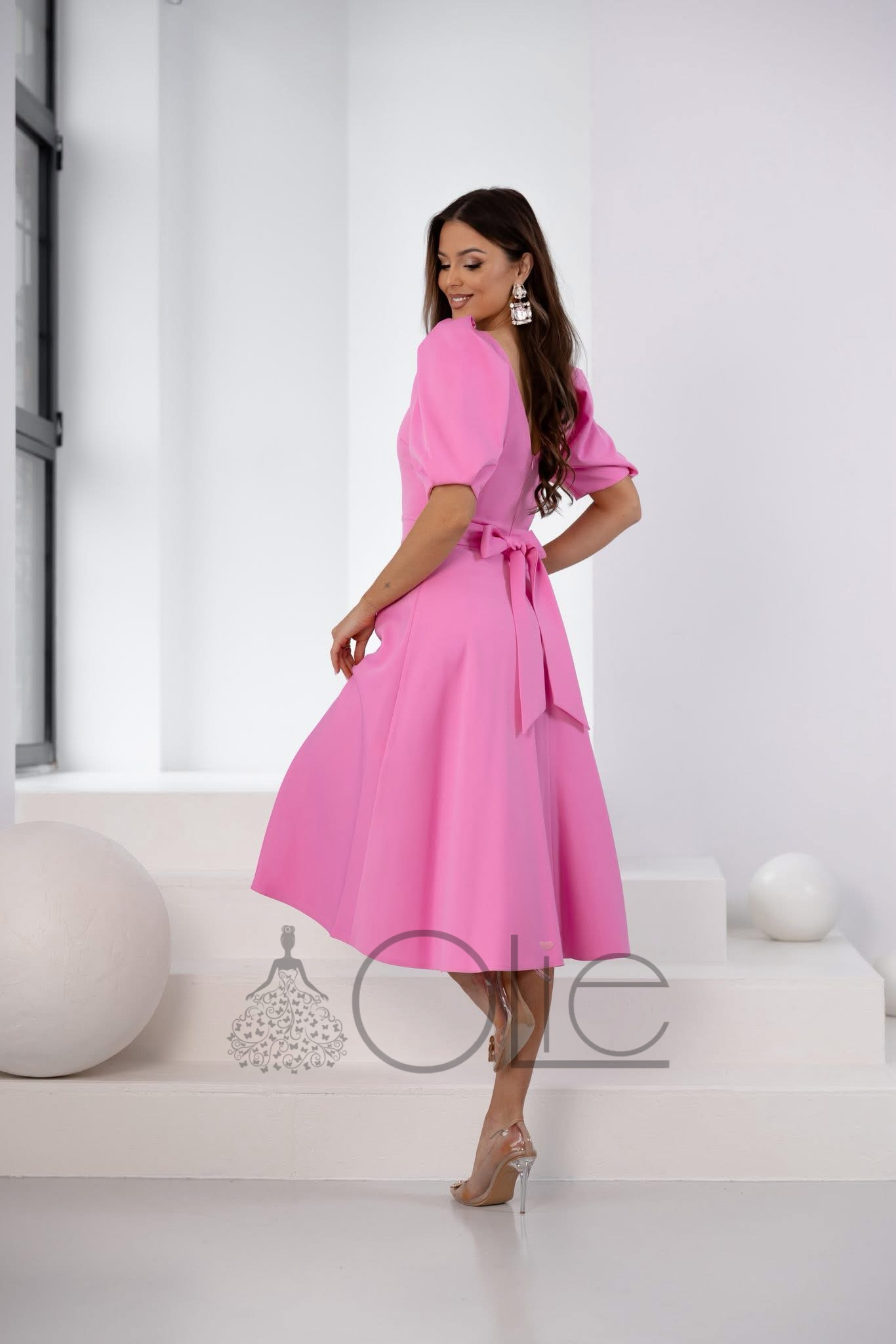 Ružové midi spoločenské šaty na svadbu