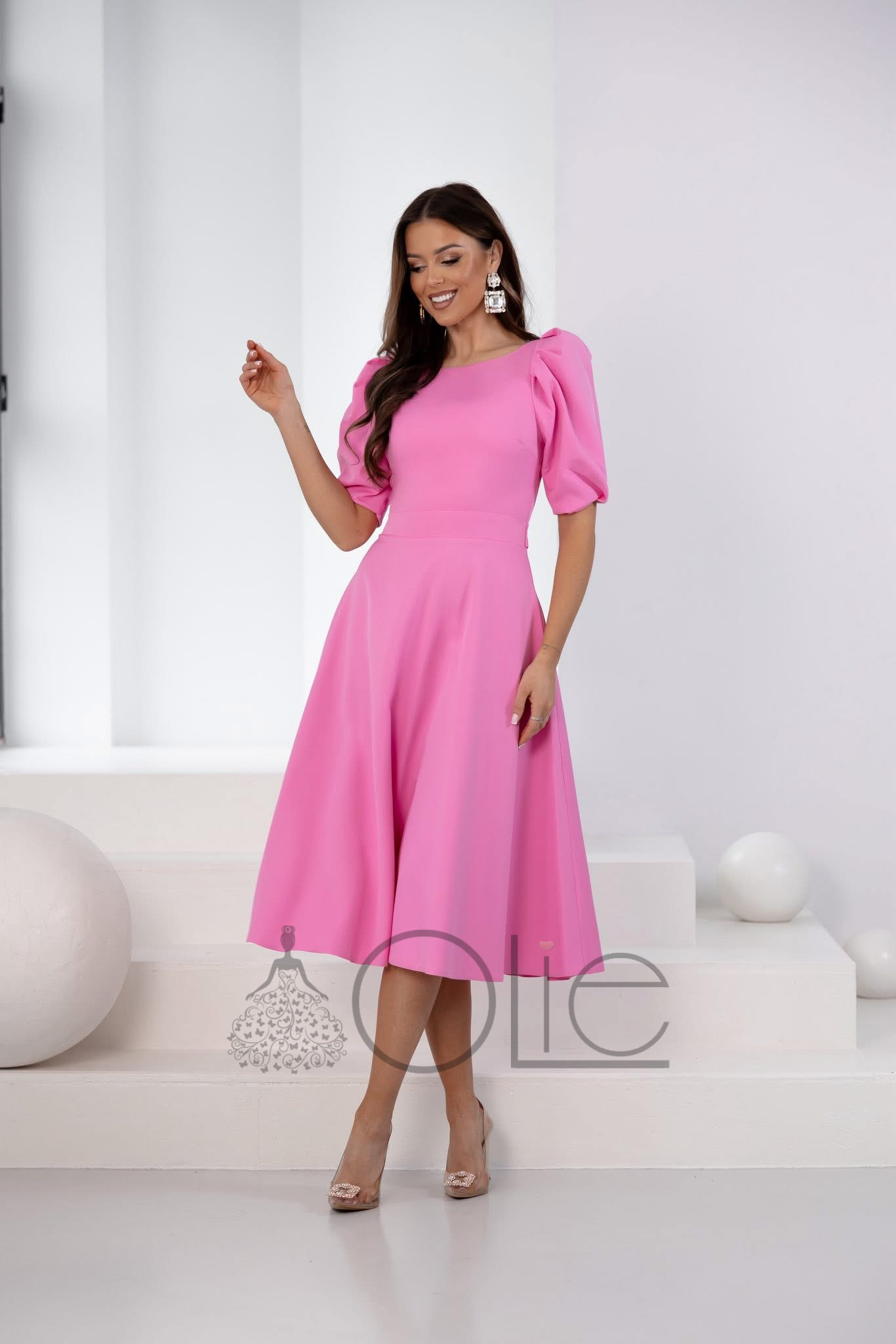 Midi dĺžka v kombinácii s rozšírenou sukňou vytvára krásnu siluetu a dodáva šatám ľahkosť pri pohybe. Vrchná časť je navrhnutá jednoducho a vkusne, pričom krátke naberané rukávy dodávajú modelu jemný romantický nádych. Zvýraznený pás prirodzene formuje postavu a podčiarkuje ženskosť.