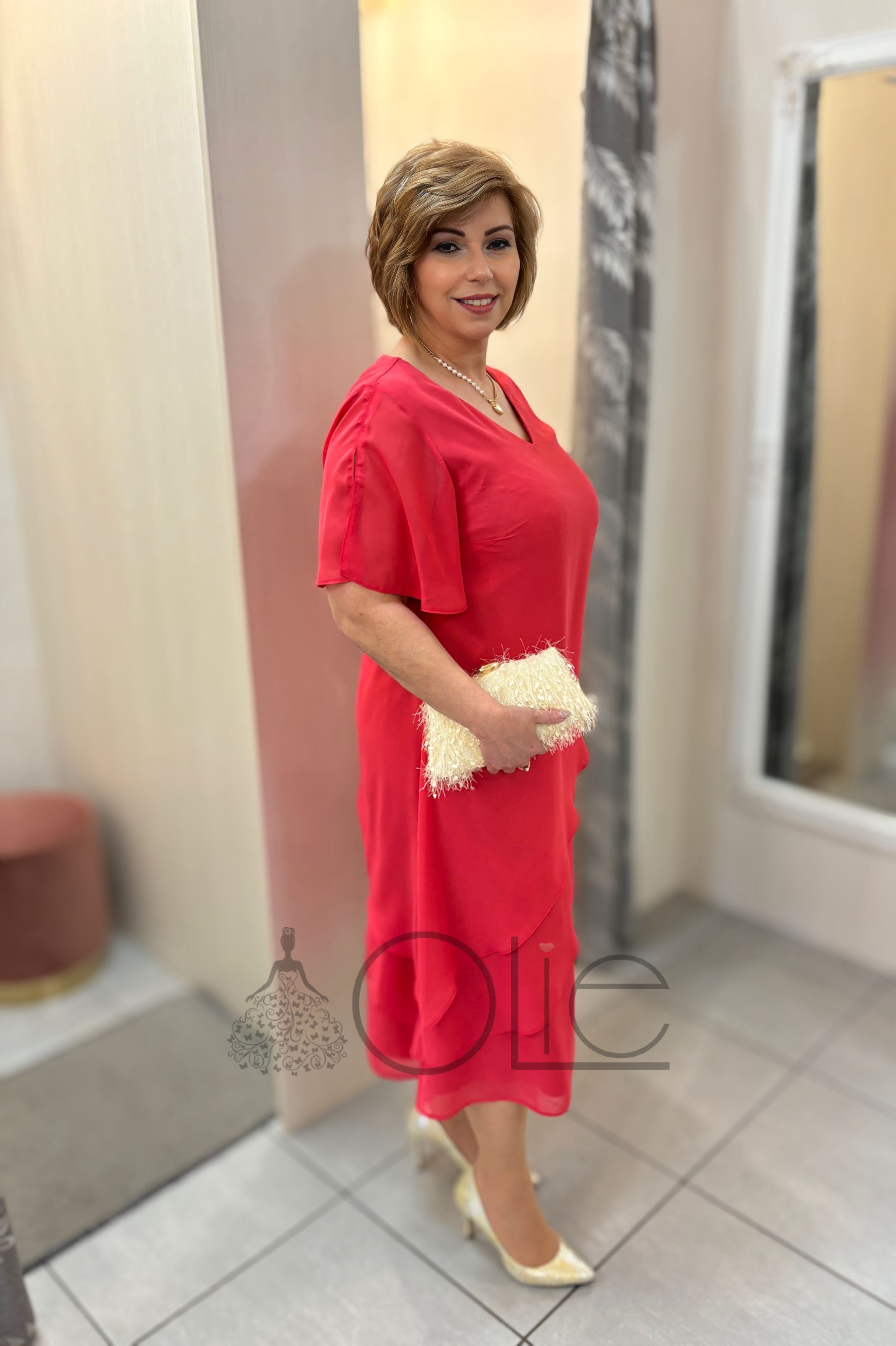Koralové šifónové spoločenské midi šaty