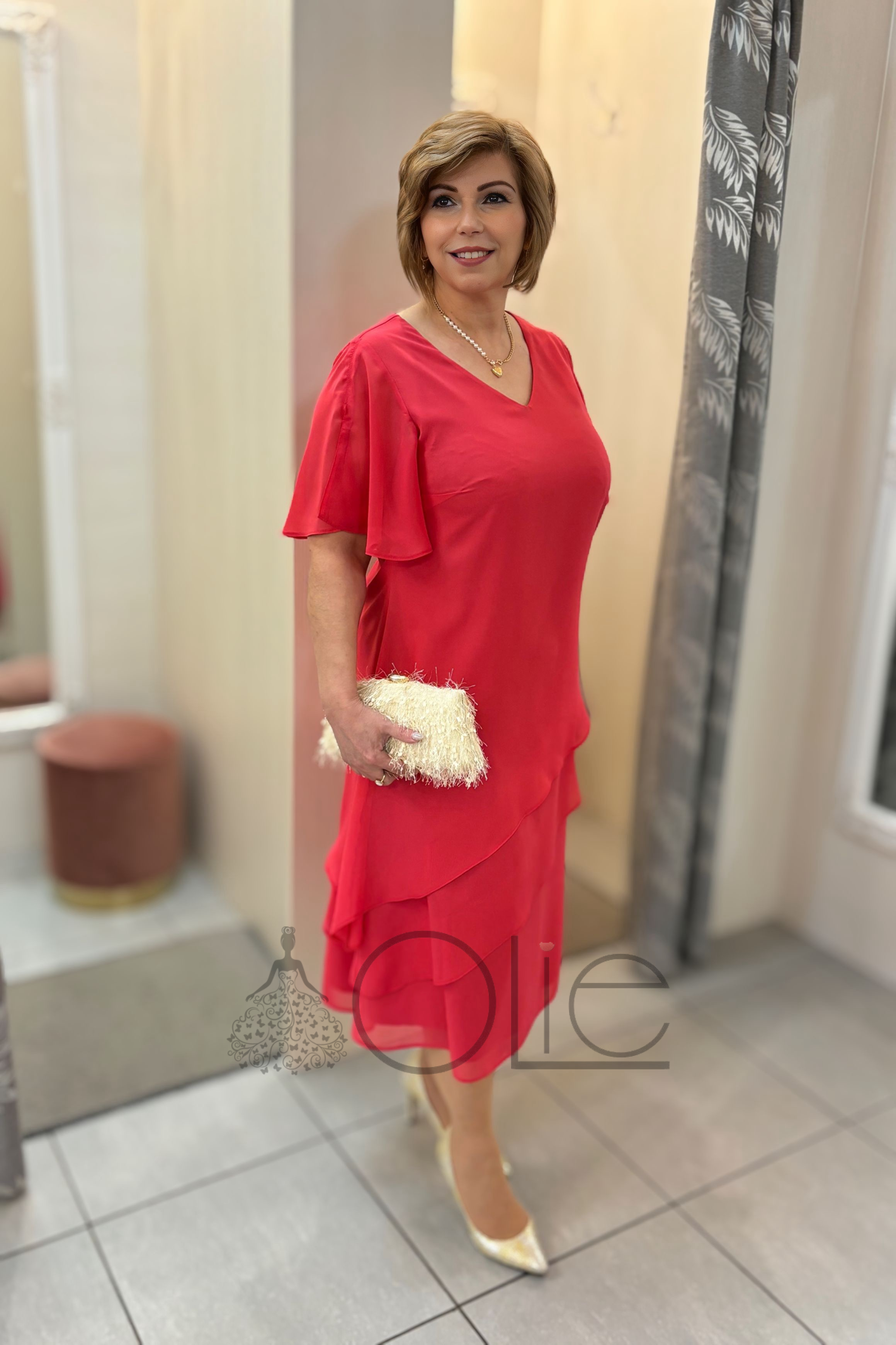 Strih je navrhnutý tak, aby lichotil rôznym typom postavy. Voľnejší, splývavý dizajn krásne schováva nedostatky postavy a robí tieto spoločenské šaty ideálnymi aj pre plnšie postavy. Vrstvený efekt sukne a jemné rukávy dodávajú modelu ľahkosť a eleganciu.