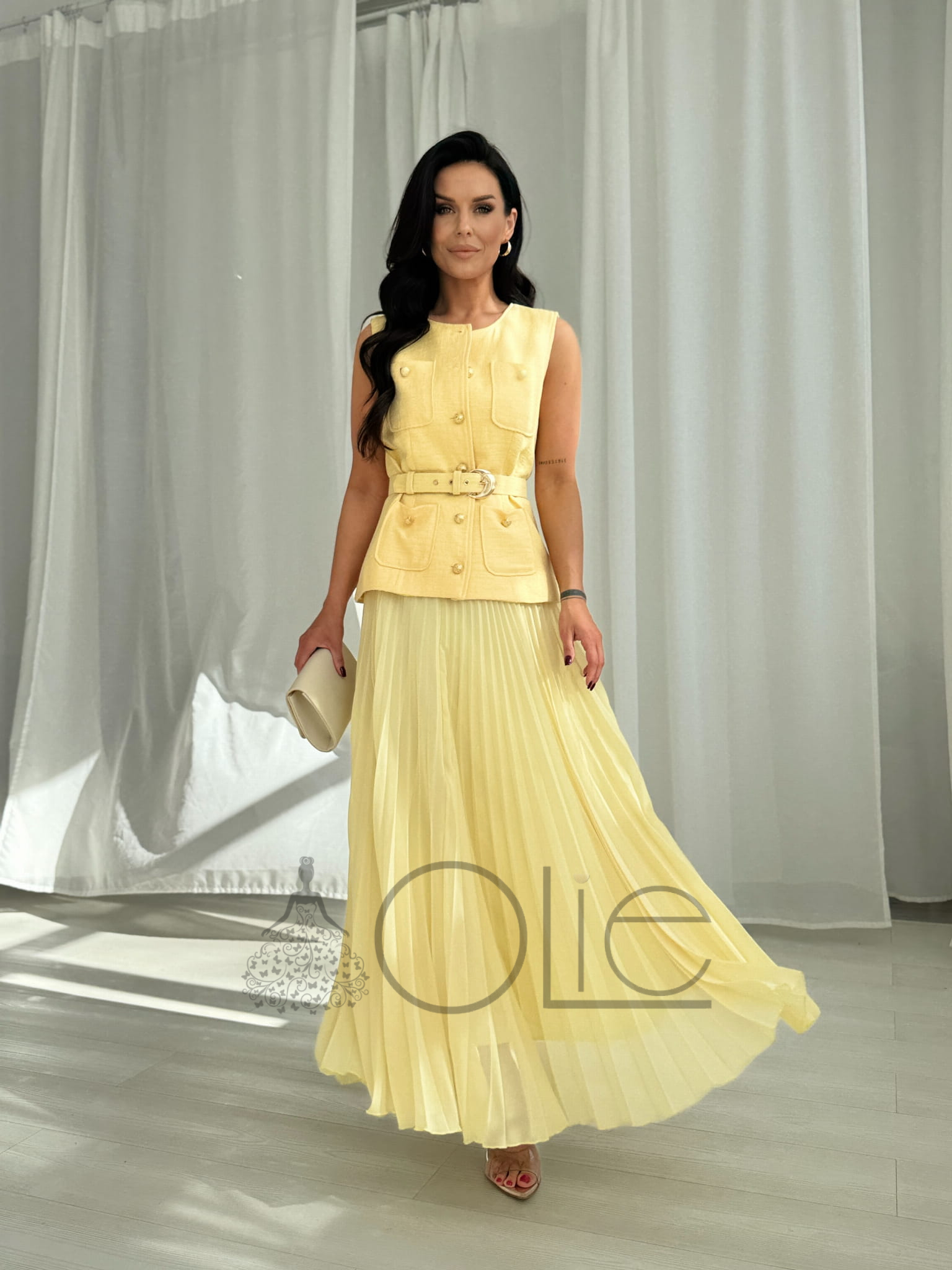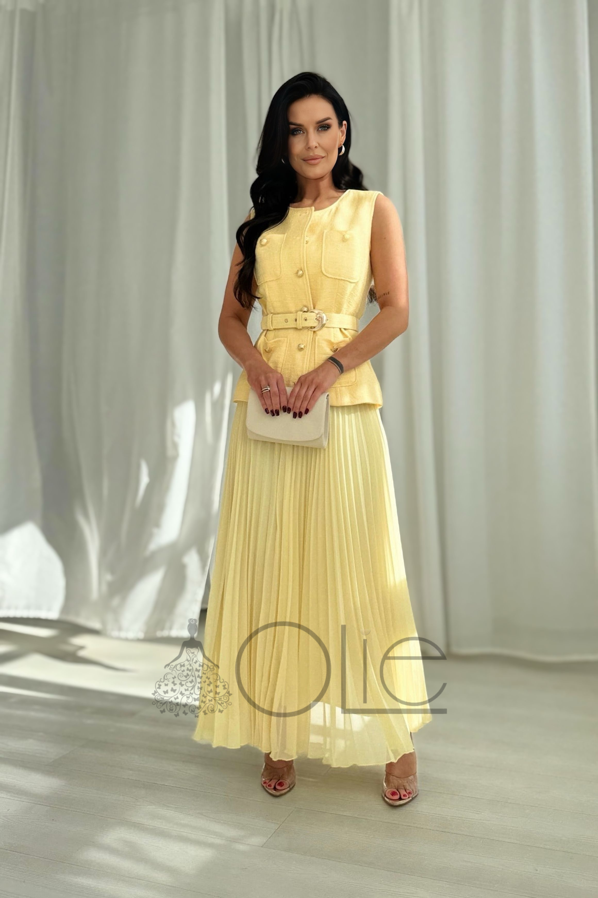Oživte svoj šatník štýlovým kúskom, ktorý spája eleganciu s ľahkosťou. Tento dámsky komplet v jemnej žltej farbe pôsobí sviežo, žensky a je ideálny na spoločenské udalosti, letné oslavy aj príjemné chvíle v meste.